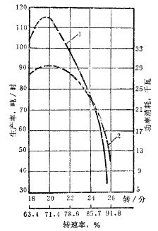 于71~75%范圍內(nèi)磨機(jī)的處理能力更高,轉(zhuǎn)速率低于或高于這個范圍時處理能力便趨于降低。磨機(jī)輸入功率與轉(zhuǎn)速率的關(guān)系和生產(chǎn)率與轉(zhuǎn)速率的關(guān)系相似,按磨碎每噸產(chǎn)品的動力消耗計,則一般隨轉(zhuǎn)速率降低而減少。