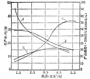 風(fēng)量大,單位時間內(nèi)輸送的物料多,產(chǎn)量就高;但同時也由于風(fēng)量大、風(fēng)速高,磨礦產(chǎn)品也隨之變粗。風(fēng)量與產(chǎn)量、產(chǎn)品粒度的關(guān)系如圖2 所示。