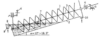 螺旋分級機(jī)的結(jié)構(gòu)如圖3-4-15所示。分級槽2呈傾斜安置,傾角一般為12。~18.5。,槽的底部為半圓形。礦漿從槽的中間部位進(jìn)料口7給入,在分級槽下端的分級帶完成分級。細(xì)粒級經(jīng)槽子下端溢流堰8隨水流從溢流排出口9排走。粗粒級產(chǎn)物在分級帶沉降,然后由螺旋1將其運(yùn)至槽子上端的沉砂排出口10排出機(jī)外。螺旋安裝在中空主軸3上,主軸兩端由軸承4支承,軸的上端設(shè)有傳動裝置5,軸的下端置于提升機(jī)構(gòu)之內(nèi),必要時可調(diào)節(jié)螺旋在槽內(nèi)的高度。