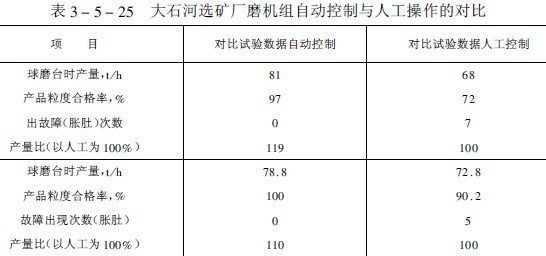 我國(guó)東風(fēng)螢石公司浮選廠(chǎng)和首鋼大石河選礦廠(chǎng)磨礦分級(jí)自動(dòng)控制經(jīng)驗(yàn)表明,采用自動(dòng)控制系統(tǒng)時(shí),磨礦操作的各項(xiàng)指標(biāo)的波動(dòng)范圍均比人工操作小(見(jiàn)表3-5-25和表3-5-26)。