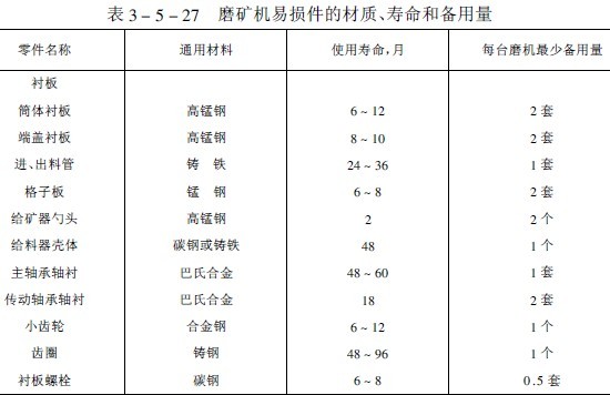 我國(guó)選礦廠(chǎng)生產(chǎn)實(shí)踐中球磨機(jī)易損件的材質(zhì)、使用壽命和設(shè)備用量列入表3-5-27中。常見(jiàn)故障、原因和排除方法見(jiàn)表3-5-28。