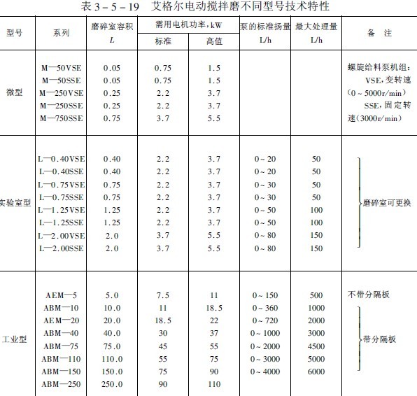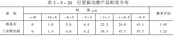 的轉動形成了筒繞Ⅰ號軸的公轉;Ⅱ號輪帶動Ⅵ號輪形成磨筒繞其自身軸的自轉。這種磨機兼有行星磨和振動磨二者的特點,具有高頻沖擊和磨剝的雙重作用,故磨碎作用強,是一種有效的超細磨碎設備。表3-5-20示出了用該磨機磨碎鋯英石和工業(yè)氧化鋁的產品粒度分布。