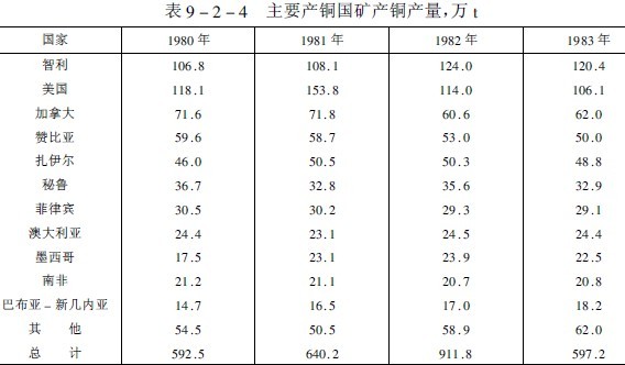 目前世界上采銅國家已有57個,但資本主義世界主要礦產(chǎn)銅生產(chǎn)國約11個(表9-2-4),其中美國、智利、加拿大和贊比亞為四個較大產(chǎn)銅國,約占資本主義世界礦產(chǎn)銅總產(chǎn)量的60%左右。除上述四國外,再加扎伊爾、秘魯、菲律賓和澳大利亞,約占資本主義世界礦產(chǎn)銅總量的83%。