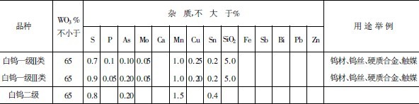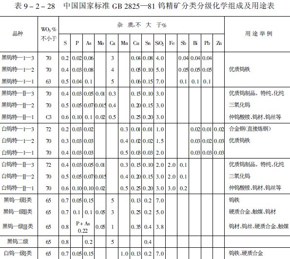 上述情況表明,冶煉對鎢精礦的質(zhì)量要求是非常高的。但市面上并無統(tǒng)一標準,通常是冶煉廠根據(jù)自己所具備的工藝條件,來選購所需的鎢精礦?,F(xiàn)將我國及世界有關國家所擬定的鎢精礦質(zhì)量標準,分別列表于后。表9-2-28為我國鎢精礦質(zhì)量標準,同時還規(guī)定可根據(jù)用戶需要和資源特點,自訂企業(yè)標準,這可使生產(chǎn)單位和使用單位在執(zhí)行標準時有靈活性。
