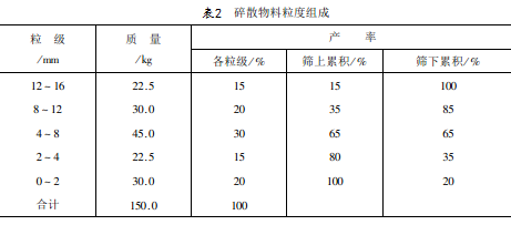 試驗(yàn)結(jié)果處理的基本內(nèi)容是計(jì)算產(chǎn)率。產(chǎn)率分為粒級(jí)產(chǎn)率與累積產(chǎn)率,粒級(jí)產(chǎn)率是該粒級(jí)的質(zhì)量占被篩物料總質(zhì)量的百分率,累積產(chǎn)率又分為篩上累積產(chǎn)率(又叫正累積)及篩下累積產(chǎn)率(又叫負(fù)累積)。正累積產(chǎn)率是大于某一篩孔的各粒級(jí)產(chǎn)率之和,負(fù)累積產(chǎn)率是小于某一篩孔的各粒級(jí)產(chǎn)率之和。在計(jì)算粒級(jí)產(chǎn)率時(shí),“被篩物料總質(zhì)量”可以用各粒級(jí)質(zhì)量之和,也可以用原試樣的質(zhì)量,此時(shí)把損失量加入較細(xì)級(jí)別,認(rèn)為篩分時(shí)呈灰塵飛揚(yáng)了。基本的篩分試驗(yàn)記錄及結(jié)果處理如表2所示。