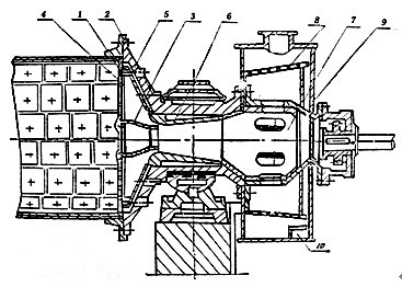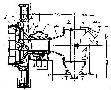 3、邊緣傳動球磨機的卸料端(圖3)。卸料篦子1和磨頭2間有葉片3,在篦子的中部裝有螺旋葉片4,葉片3能將物料帶起并撒在螺旋葉片4上,通過螺旋葉片4和裝在套筒5里的螺旋葉片6使物料順暢地從軸頸中卸出,7為漏斗,用螺釘固定在軸頸的端面上,物料沿著漏斗落到控制篩8上,9為機罩,10為通風管道與排風機和收塵系統(tǒng)相聯(lián)結。