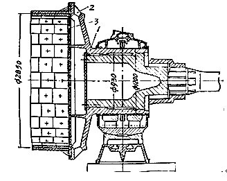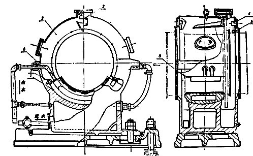 2、圖2是一種中心傳動邊緣卸料的裝置。在球磨機端蓋內表面和卸料篦板3之間,形成一個環(huán)行空間,在端蓋壁上等距切割橢圓形孔2,物料從此孔卸出,落到外罩下部(圖中外罩未畫出)。